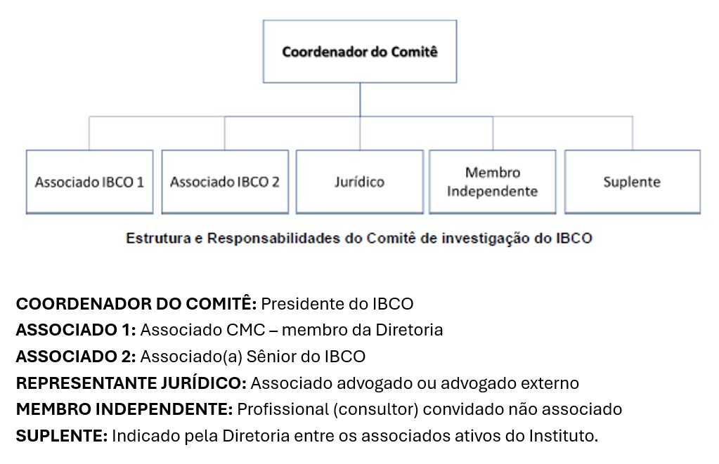 - Recebimento e Análise das Queixas: Cabe à Diretoria do IBCO receber a queixa, investigar o caso, notificar o acusado para defesa, analisar o processo e julgar a gravidade da infração (Art. 21, Parágrafo Primeiro).